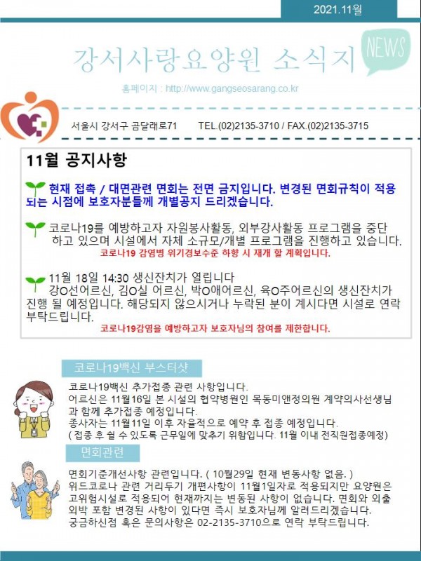 2021.11 소식지 페이지 정보 작성자 강서사랑 작성일21-11-01 16:32 조회795회 댓글0건 관련링크 이전글 다음글 목록 본문 2021.11월 강서사랑요양원 소식지 입니다.^^ 댓글목록 등록된 댓글이 없습니다. 이전글 다음글 목록